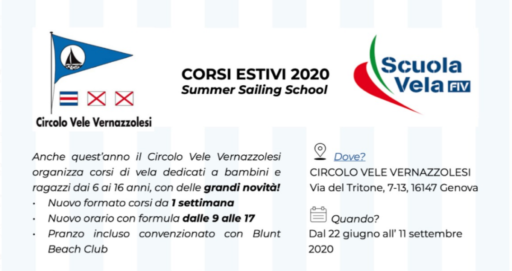 CORSO VELA PRIMAVERA ADULTI 2021 Dopo il successo ottenuto nelle scorse edizioni riprendono i corsi per adulti! Le lezioni si svolgeranno inizialmente presso la Fiera del Mare di Genova e successivamente presso la sede del Circolo Vele Vernazzolesi con imbarcazioni doppie “420” e collettive “Marta 5.10” per acquisire praticità anche nella conduzione in equipaggio. Vi […]